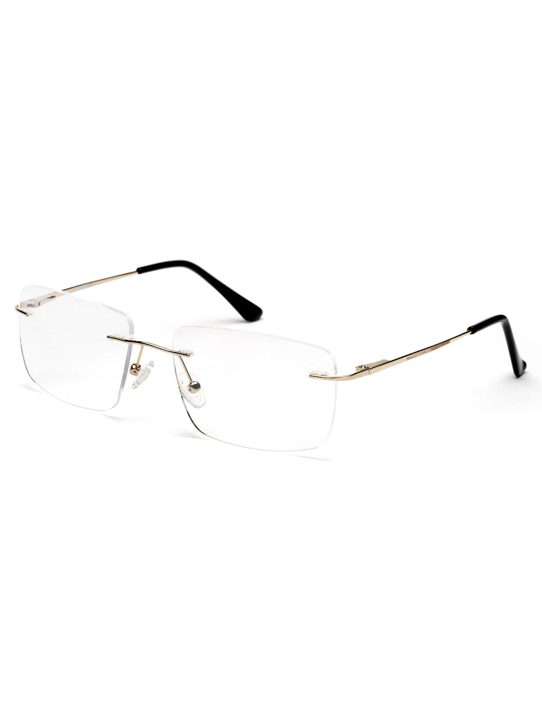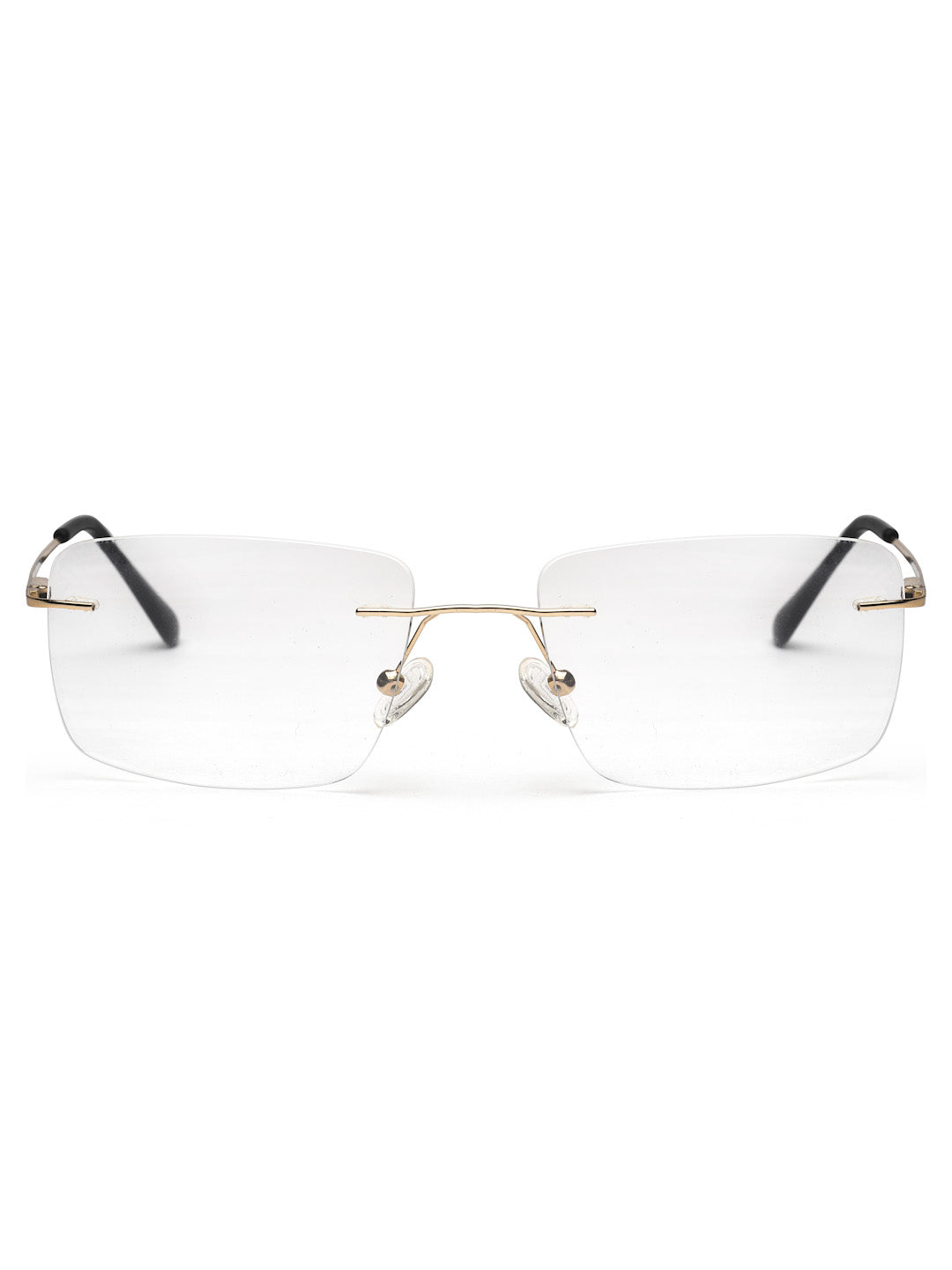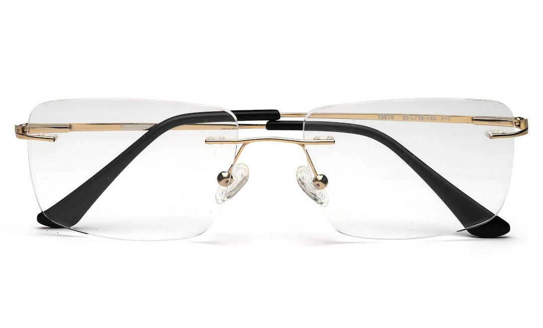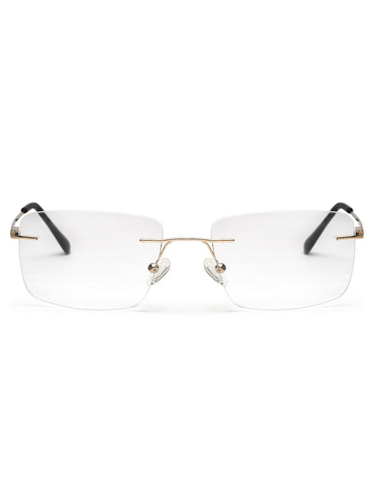 Elevate your everyday eyewear with the metallic rimless golden rectangle spectacles frames. The rimless rectangle design, paired with golden accents and golden & black temples, makes it perfect for a polished, sophisticated look.