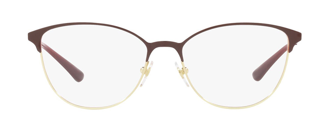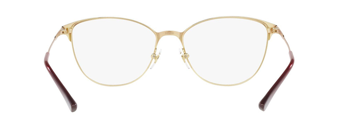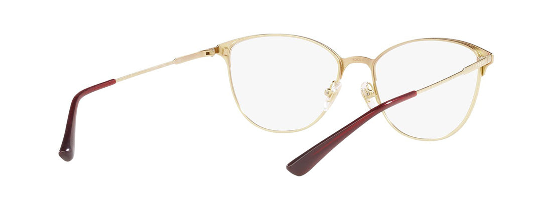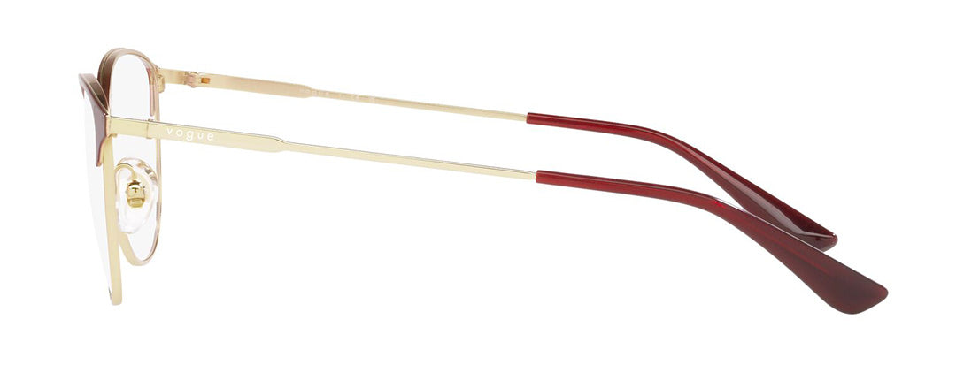 The Vogue Eyewear 0VO4261I515352 is a stylish butterfly-shaped optical frame for women. With a rich Bordeaux metal frame and gold detailing, it offers a chic and refined look, perfect for everyday elegance.