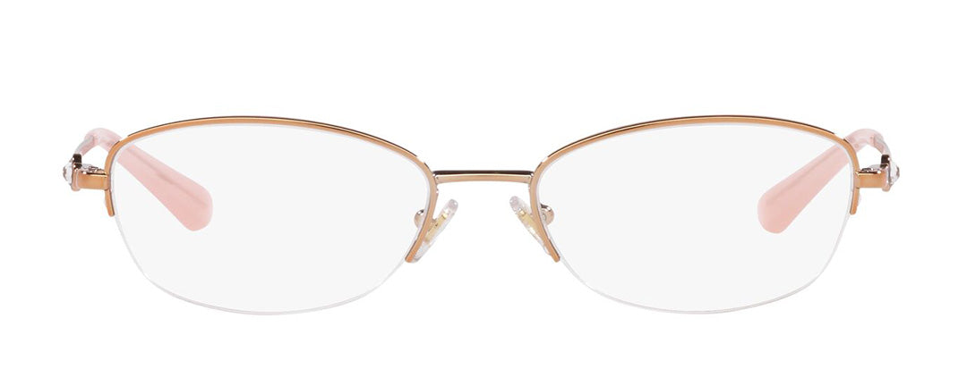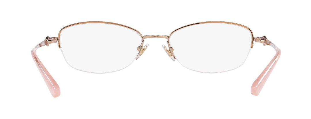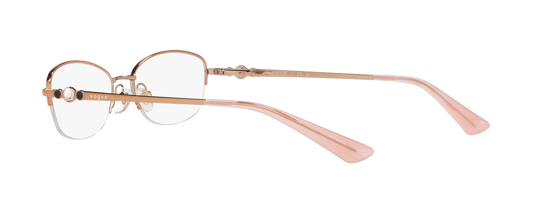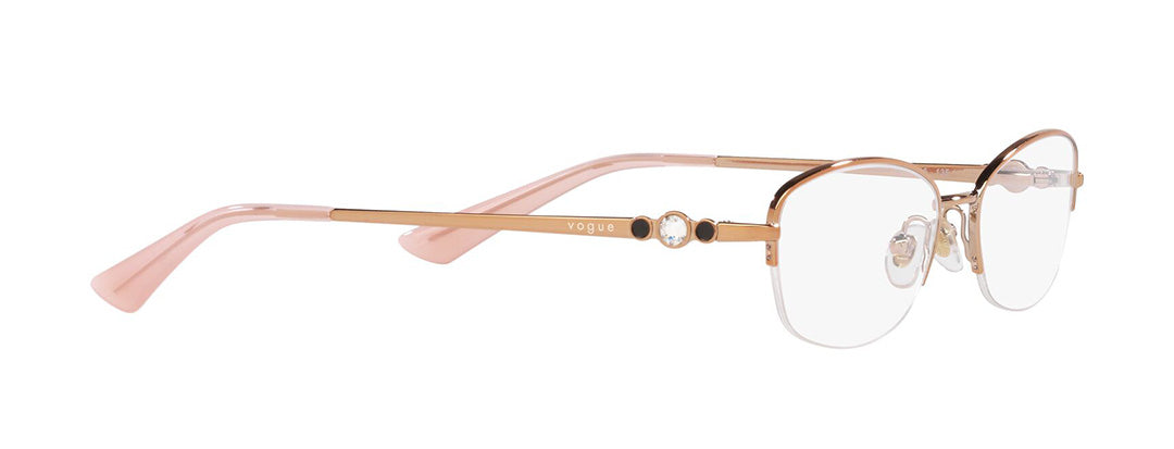 These Vogue eyewear frames present a refined oval shape in elegant gold metal. Their classic design and luxurious finish offer a sophisticated, timeless look for women.